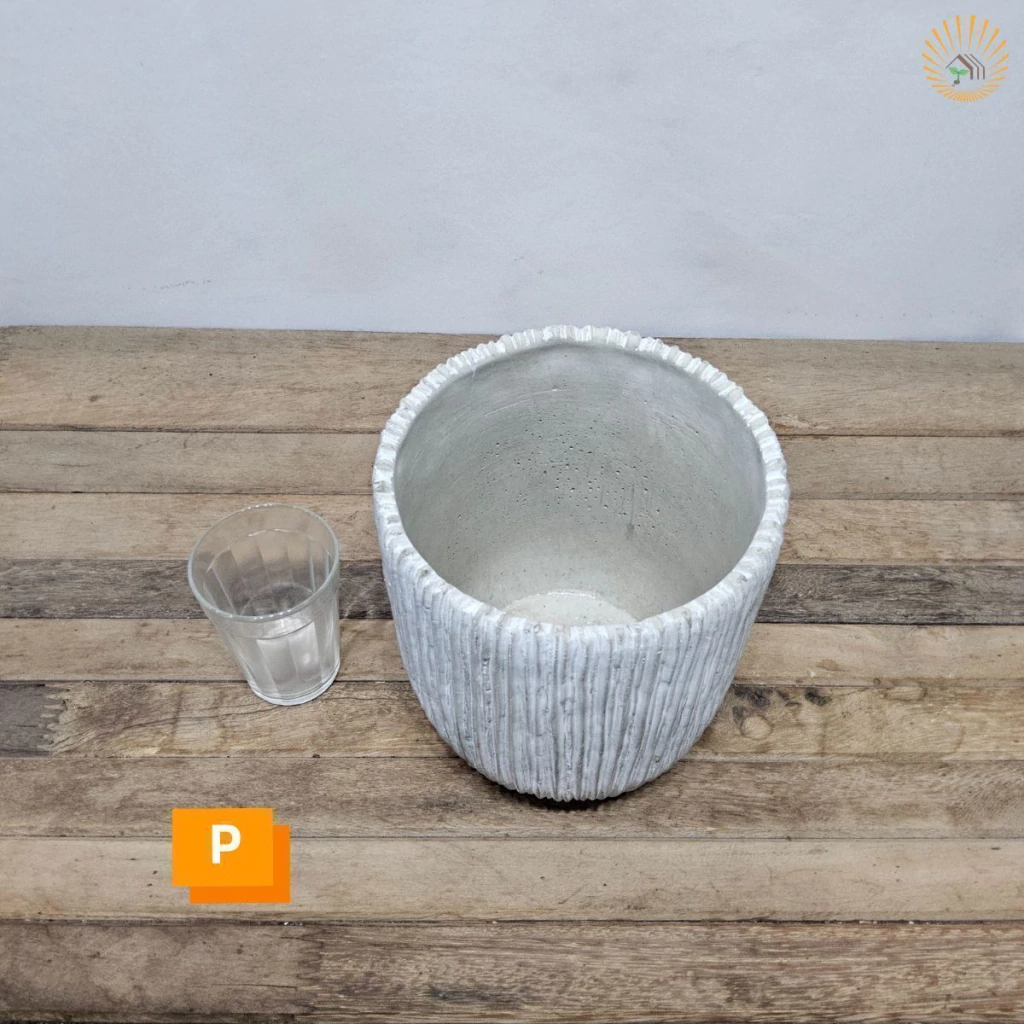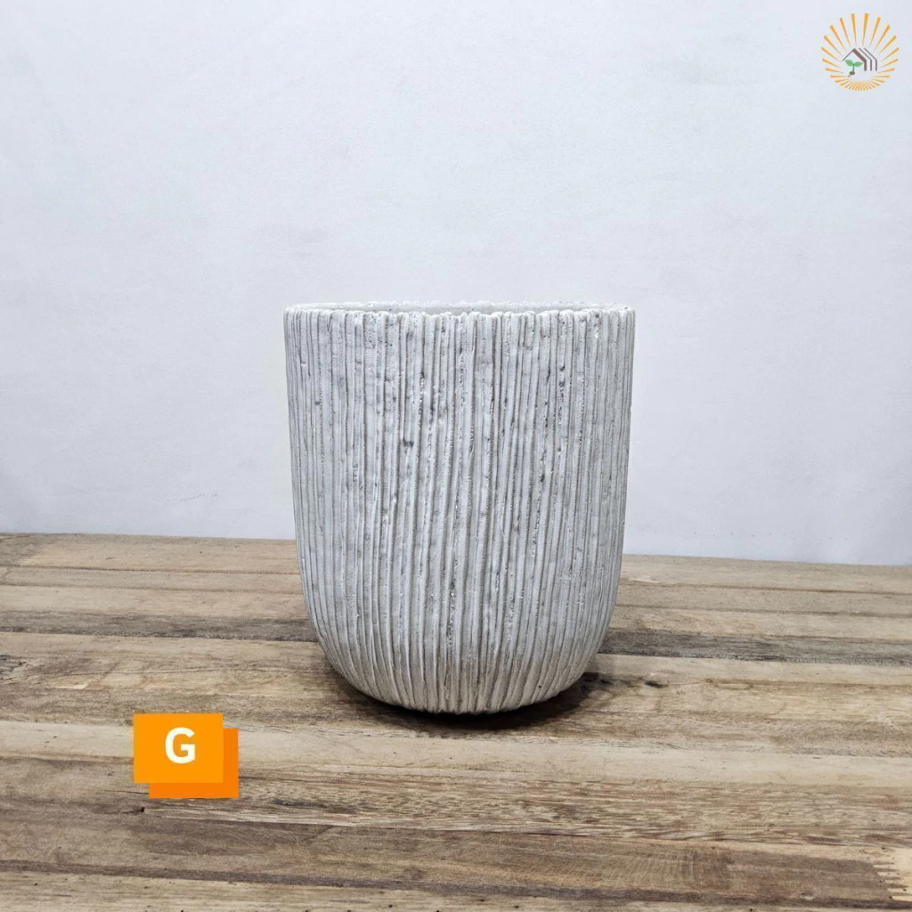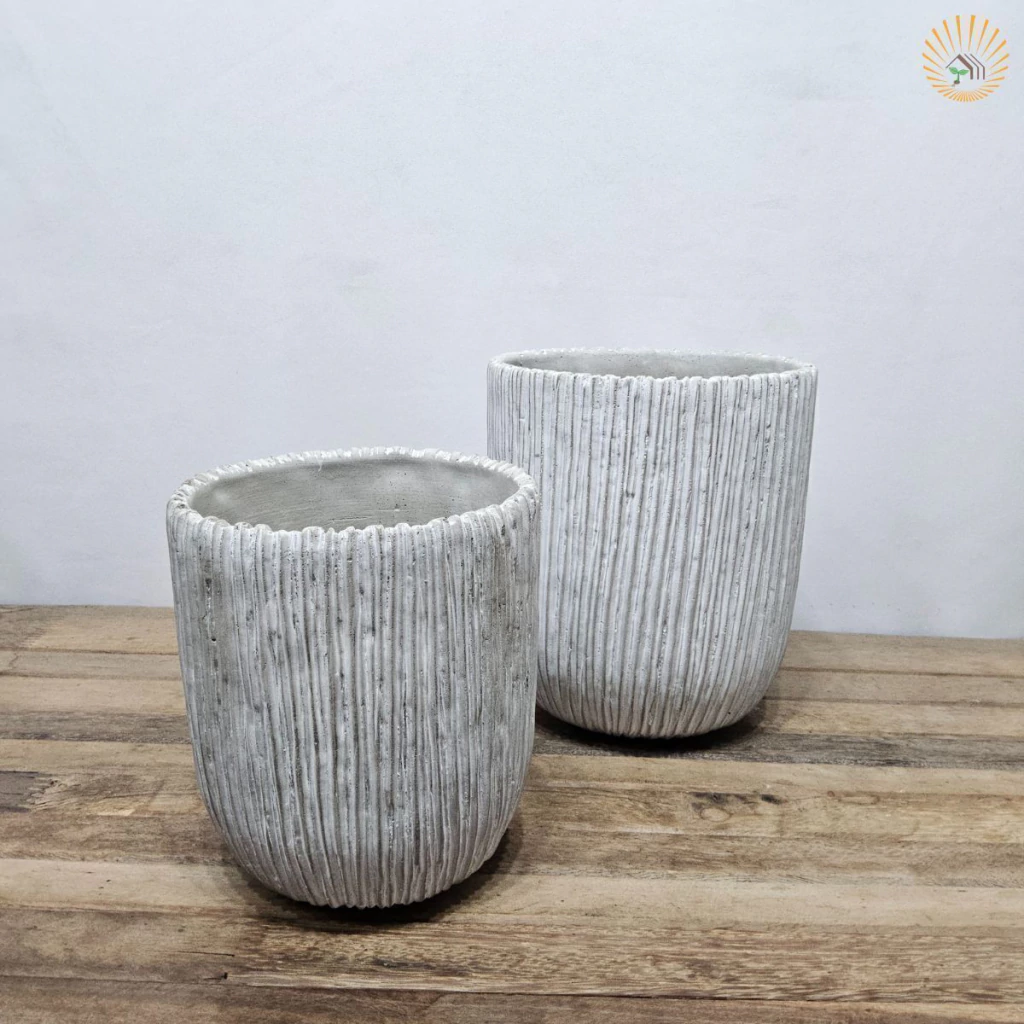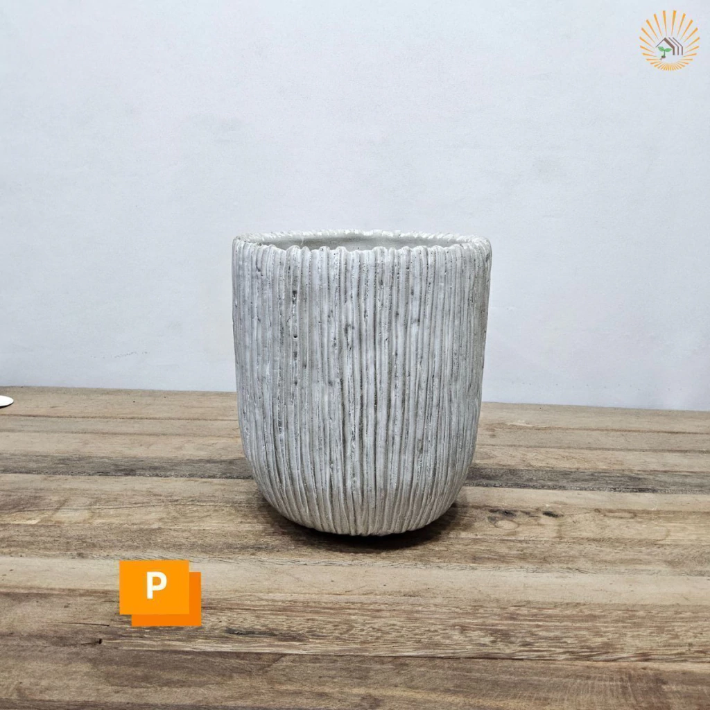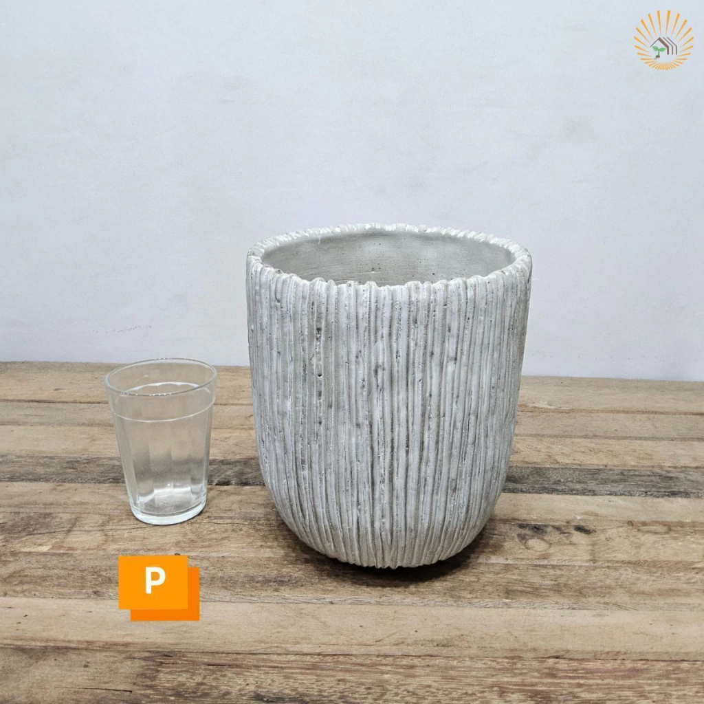 Transforme seus ambientes com este cachepot de cimento moderno e elegante. Seu design com linhas verticais em relevo traz um toque sofisticado e minimalista, perfeito para compor espaços internos ou externos.